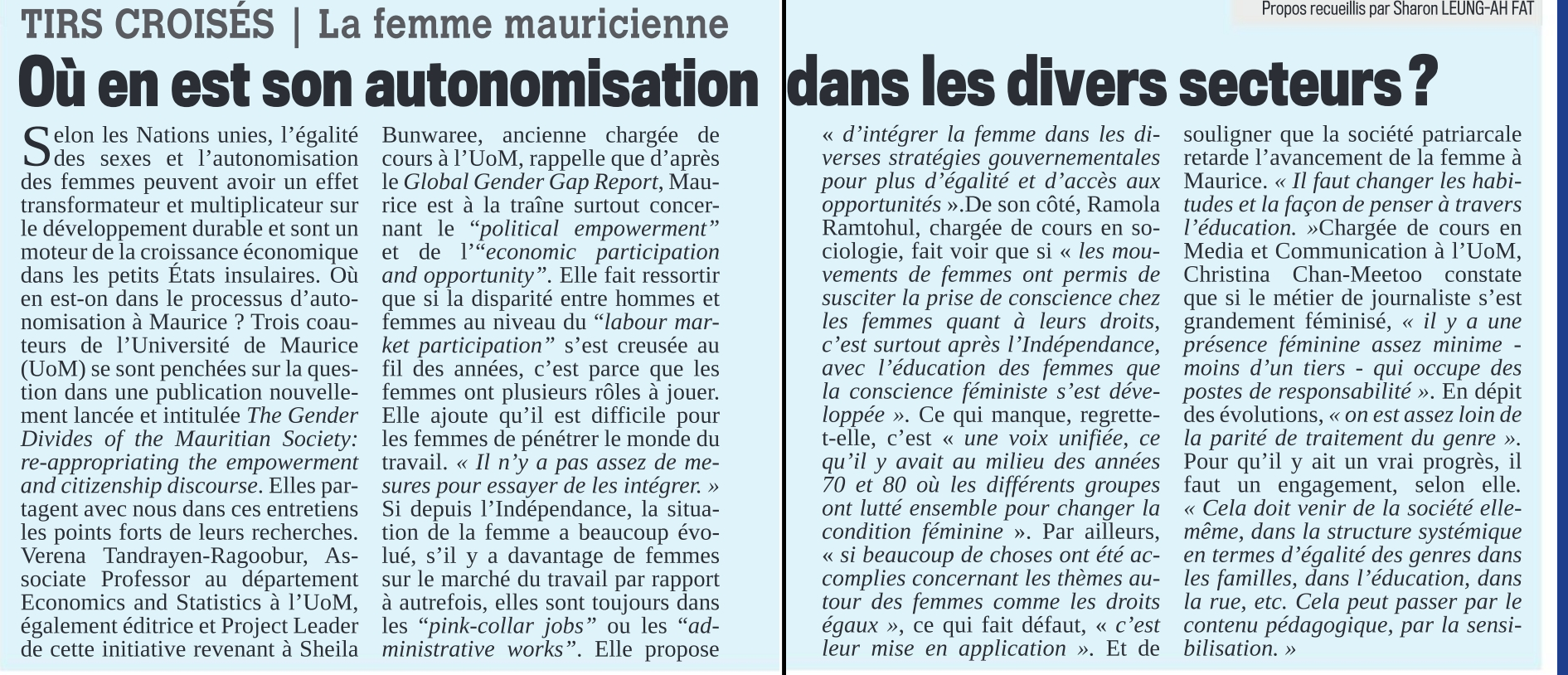La situation de la femme à Maurice et l’autonomisation (empowerment) de celle-ci sont fondamentalement tributaires des décisions politiques, mais celles-ci se heurtent elles-mêmes aux problématiques de nature religieuse qui souvent légitime une domination patriarcale. Dans une publication lancée le mardi 2 février 2021 et intitulée ‘The Gender Divides of the Mauritian Society : Re-appropriating the Empowerment and Citizenship Discourse’, les auteurs de l’ouvrage abordent cette thématique au terme d’une approche pluridisciplinaire.